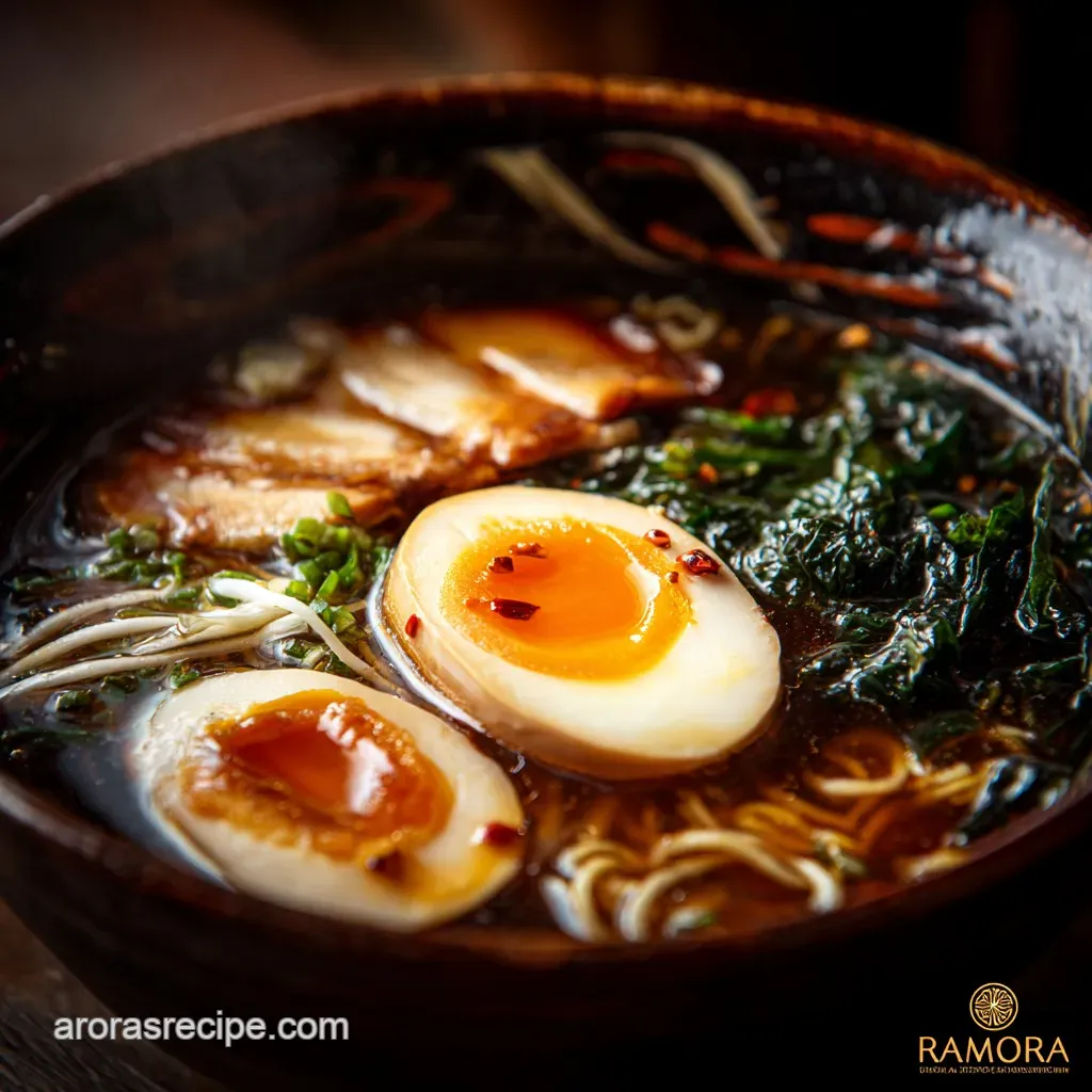 - Garnish immediately with thin slices of spring onion (scallions), nori, and your perfectly sliced Ajitama halves.