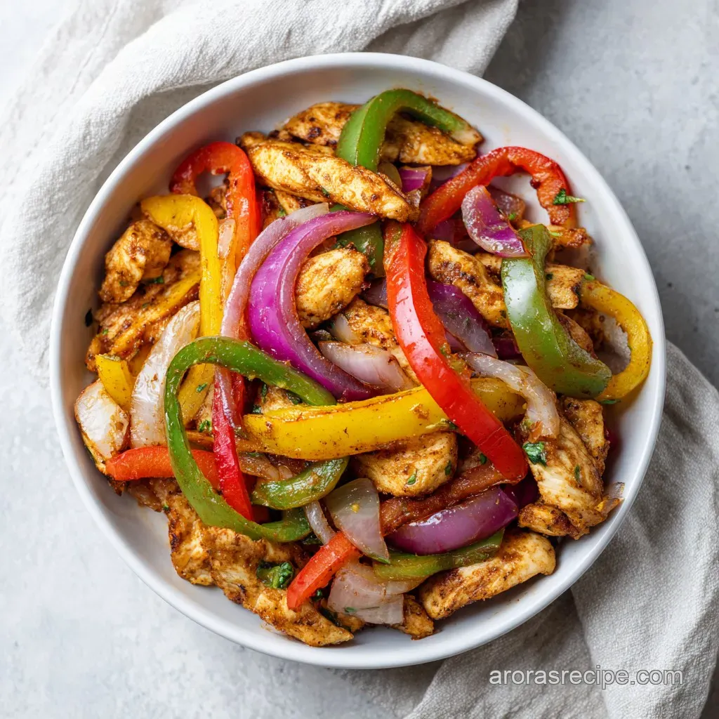 Use a base of sliced chicken breast, bell peppers, and white onion. The flavor profile comes from a marinade of olive oil, lime juice, apple cider vinegar, garlic, chili powder, cumin, smoked paprika, onion powder, oregano, sea salt, and red pepper flakes.
