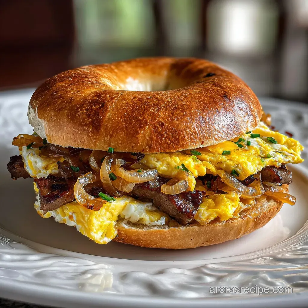 - Layer the components. Place the cheesy egg on the bottom bagel, pile the steak and onion mixture on top, then close the sandwich.